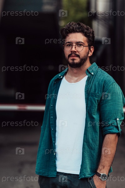Портрет современного мужчины, излучающего уверенность и стиль, на фоне природы, демонстрирующий его харизму и модную манеру поведения