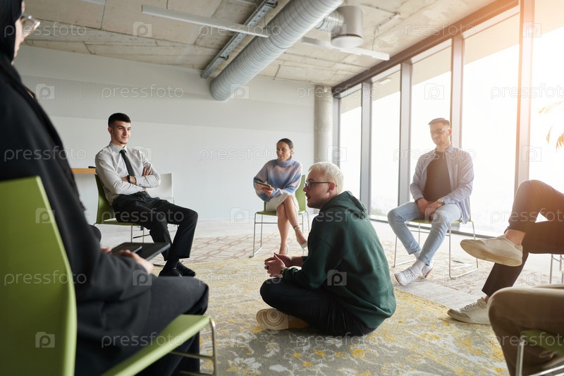 Корпоративная встреча бизнес-команды с менеджером или тренером. Группа счастливых разнообразных, многорасовых людей, сидящих в кругу
