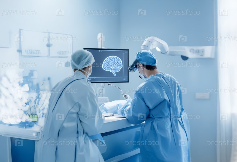 Врач и невролог используют роботизированную технологию с программным обеспечением ИИ для исследования мозга пациента. Сгенерированное изображение