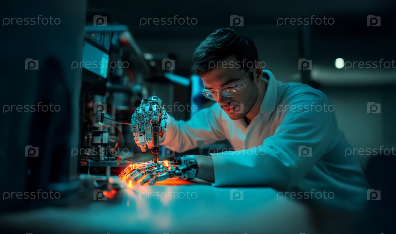 Инженер-робототехник калибрует роботизированный протез руки, демонстрируя передовые медицинские технологии. Сгенерированное изображение