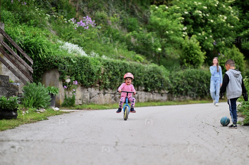 Группа детей, включая мальчика и девочку, играющих с мячом, и их маленького друга, катающегося на велосипеде, наслаждаются веселым днем на природе