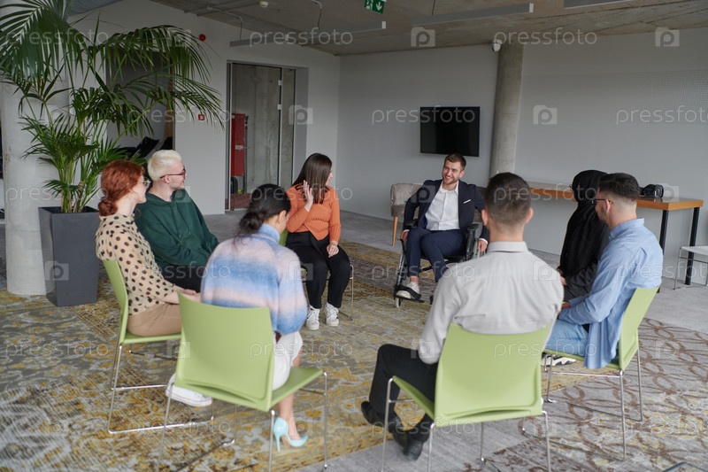Корпоративная встреча бизнес-команды с менеджером или тренером. Группа счастливых разнообразных, многорасовых людей, сидящих в кругу
