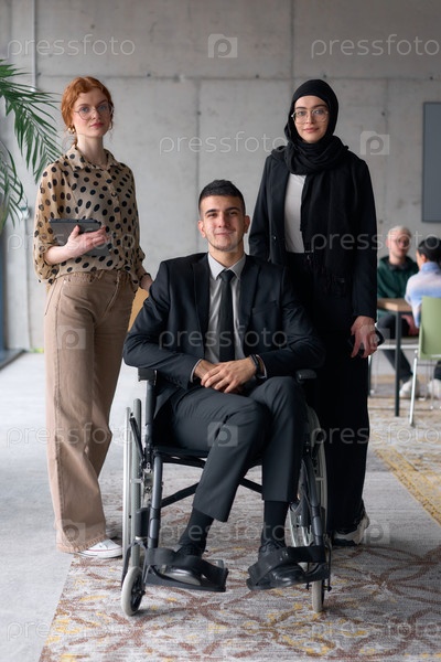 Разнообразная бизнес-команда уверенно позирует, включая улыбающегося директора, сидящего в инвалидном кресле, в окружении двух коллег-женщин, одна из которых в хиджабе, а другая держит планшет, в современной офисной обстановке
