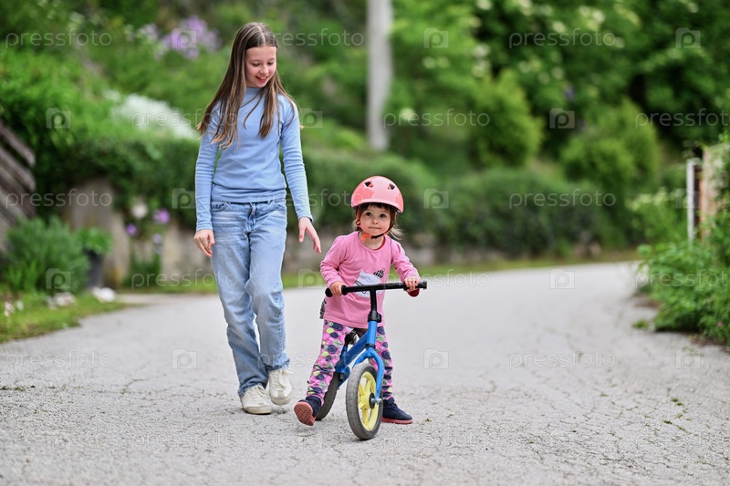 Радостная девочка-подросток подбадривает свою младшую сестру, пока она учится кататься на велосипеде, они вместе смеются и сближаются на солнечной улице