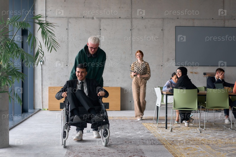 Разнообразная команда коллег по бизнесу, включая директора в инвалидной коляске, участвует в совместной дискуссии, перемещаясь по современному офисному пространству