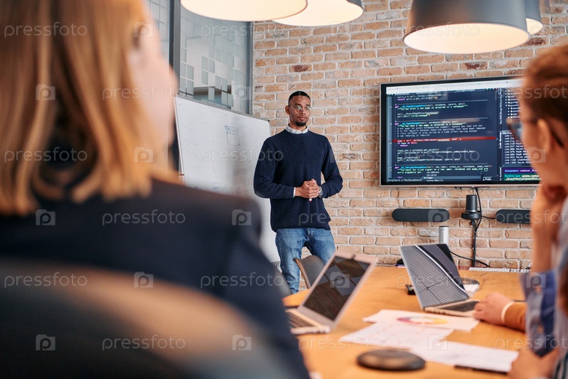 Афроамериканский бизнесмен проводит совещание, страстно представляя бизнес-план своей внимательной команде, способствуя сотрудничеству и стратегическому мышлению