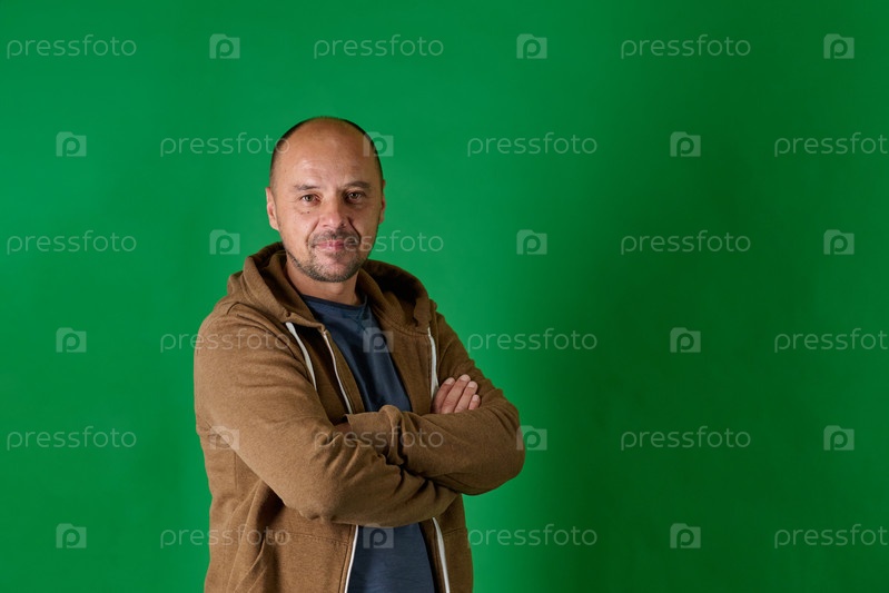 Лысый мужчина средних лет в повседневной одежде со скрещенными руками уверенно позирует на зеленом фоне студии