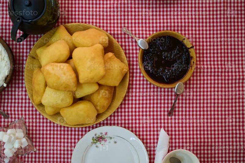 Привлекательный вид сверху позволяет увидеть восхитительную картину завтрака, включающую свежеиспеченный хлеб, восхитительный джем и согревающую чашку чая — простой, но сытный утренний пир