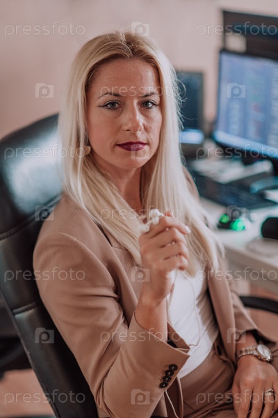 Бизнес-леди сидит в офисе программиста в окружении компьютеров, демонстрируя свою компетентность и преданность технологиям