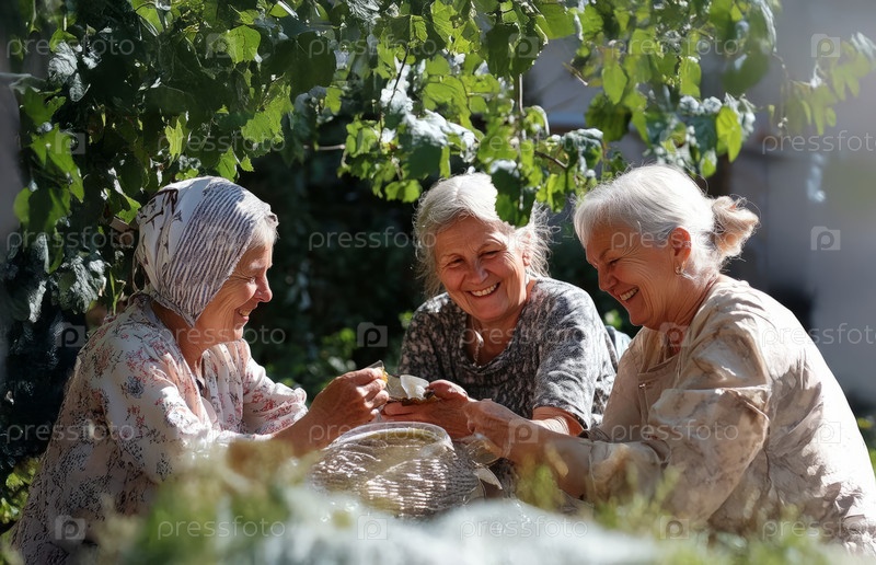 Счастливые бабушки вместе варят варенье в солнечном саду. Сгенерированное изображение