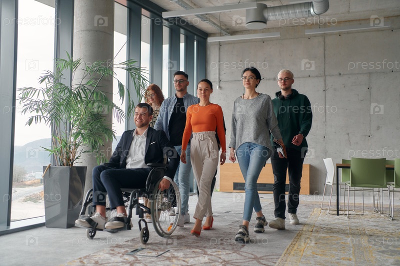 Команда профессионалов бизнеса перемещается по просторному современному офису, помогая своему руководителю, бизнесмену в инвалидной коляске, сотрудничая и перемещаясь по рабочему месту