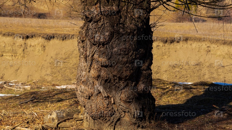 Ствол старого вяза. Отдельно стоящее дерево с наростами и необычным рисунком коры