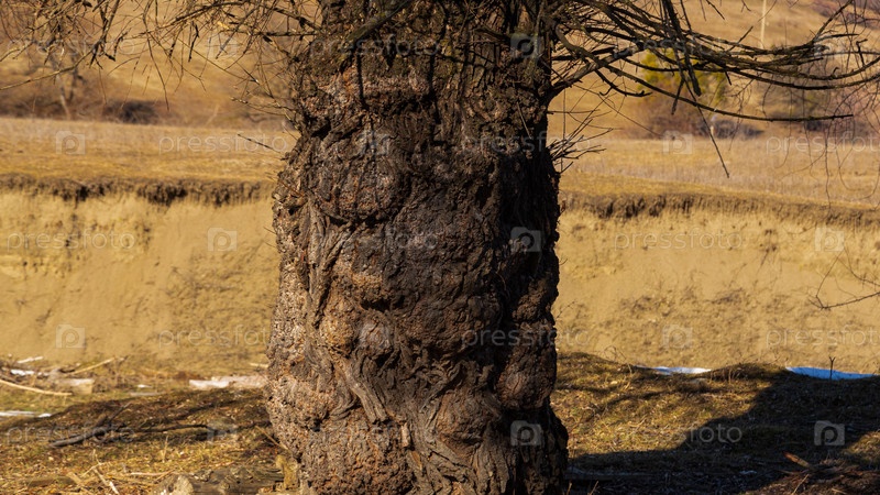 Ствол старого вяза. Отдельно стоящее дерево с наростами и необычным рисунком коры