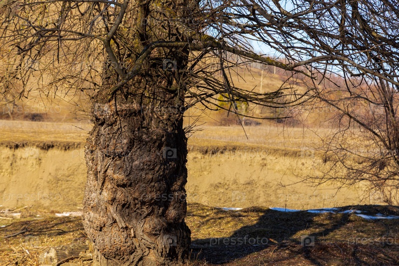 Ствол старого вяза. Отдельно стоящее дерево с наростами и необычным рисунком коры