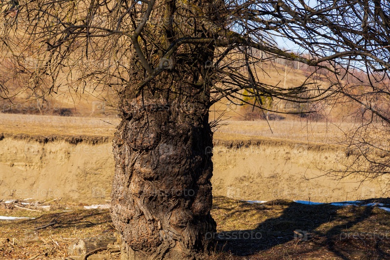 Ствол старого вяза. Отдельно стоящее дерево с наростами и необычным рисунком коры