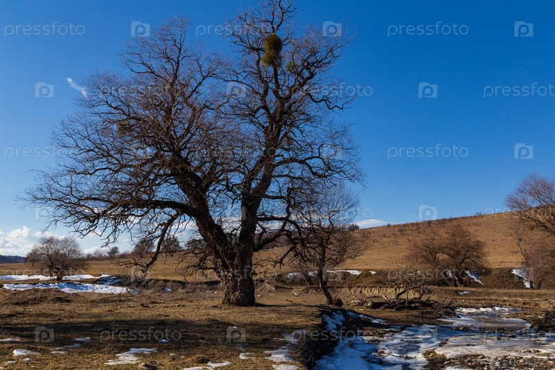 Деревья без листьев зимним днем на фоне ясного голубого неба. На стволах растет омела
