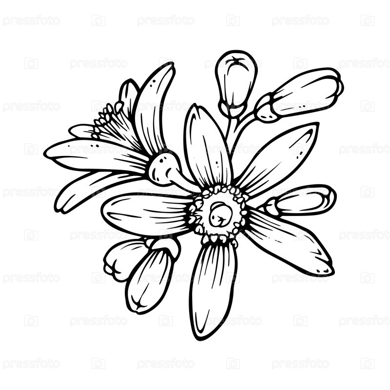 Простая композиция из цитрусовых цветов с бутонами. Цветение лимона или мандарины. Изолированная иллюстрация на белом фоне. Чернильный эскиз в стиле гравюры. Контурный рисунок от руки лимонов для весеннего дизайна посуды и текстиля. Simple composition of