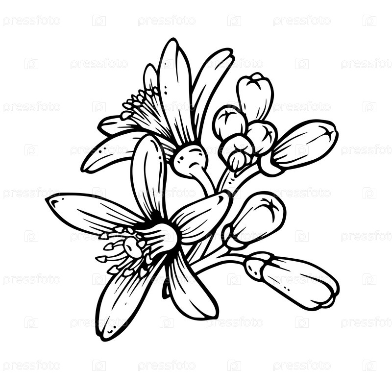 Цветящий лимон или мандарин. черно-белая простая композиция из цитрусовых цветов с бутонами. рисунок рукой чернилами или тушью в стиле гравюр для весеннего дизайна посуды и текстиля. цветение лимона или мандарины. черно-белый простой состав cit