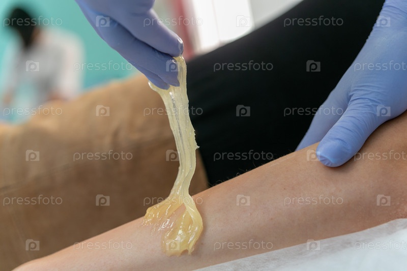 Процедура удаления волос на руке красивой женщины с помощью сахарной пасты или воска меда и синих перчаток для рук - концепция депиляции и красоты
