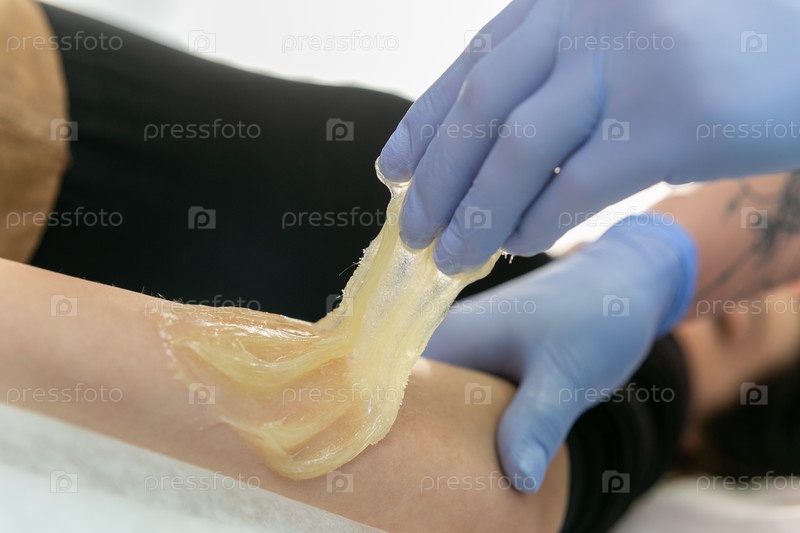 Процедура удаления волос на руке красивой женщины с помощью сахарной пасты или воска меда и синих перчаток для рук - концепция депиляции и красоты