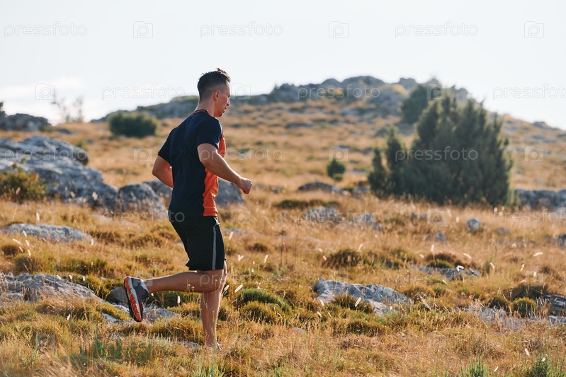 Решительный спортсмен бежит по пересеченной горной местности на рассвете