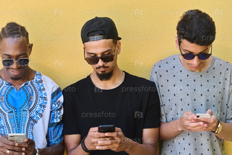 Группа подростков стоит вместе у стены, используя смартфоны