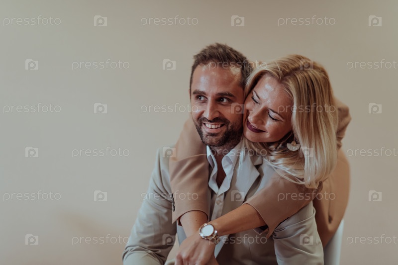Пара бизнесменов позирует для совместной фотографии на бежевом фоне, запечатлевая свое профессиональное партнерство и создавая вневременной образ единства и успеха