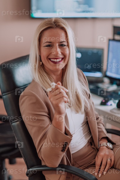 Бизнес-леди сидит в офисе программиста в окружении компьютеров, демонстрируя свою компетентность и преданность технологиям