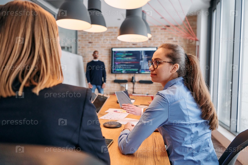 Афроамериканский бизнесмен проводит совещание, страстно представляя бизнес-план своей внимательной команде, способствуя сотрудничеству и стратегическому мышлению