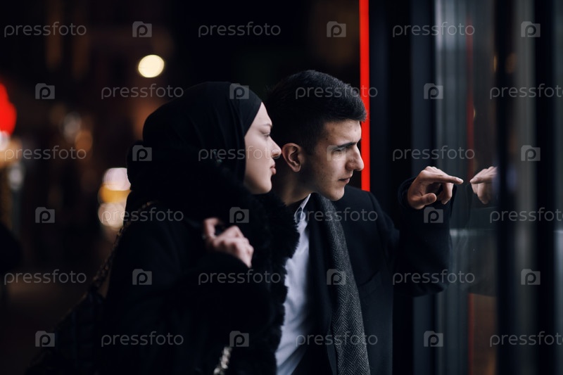 Счастливая мультикультурная деловая пара прогуливается вместе на улице города ночью возле витрины ювелирного магазина