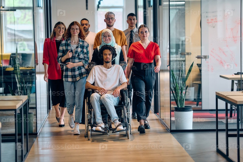 Разнообразная группа молодых бизнесменов собирается в современном офисе стартапа со стеклянным ограждением, демонстрируя инклюзивность: среди них есть человек в инвалидной коляске, афроамериканский молодой человек и мусульманка в хиджабе