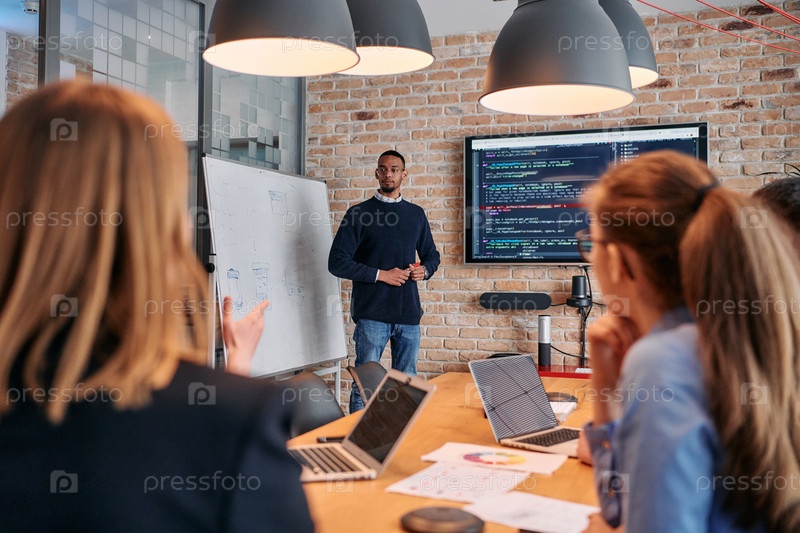 Афроамериканский бизнесмен проводит совещание, страстно представляя бизнес-план своей внимательной команде, способствуя сотрудничеству и стратегическому мышлению