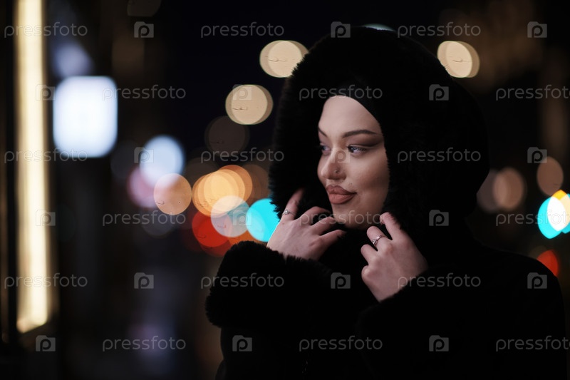 Мусульманка идет по городской улице холодной зимней ночью в хиджабе