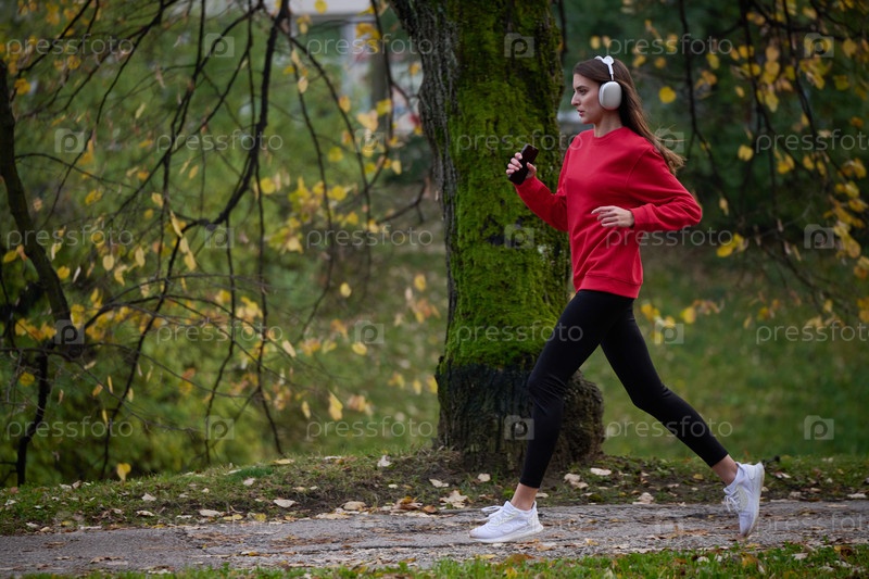 Молодая красивая женщина бежит в осеннем парке и слушает музыку в наушниках на смартфоне