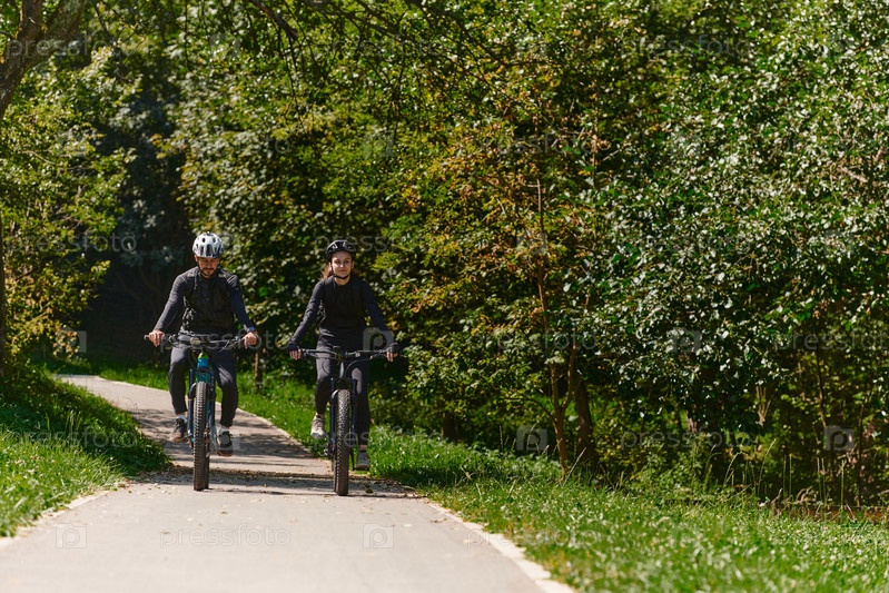 Счастливая пара, одетая в профессиональную велосипедную экипировку, наслаждается романтической велопрогулкой по парку, окруженному современными природными достопримечательностями, излучая любовь и счастье