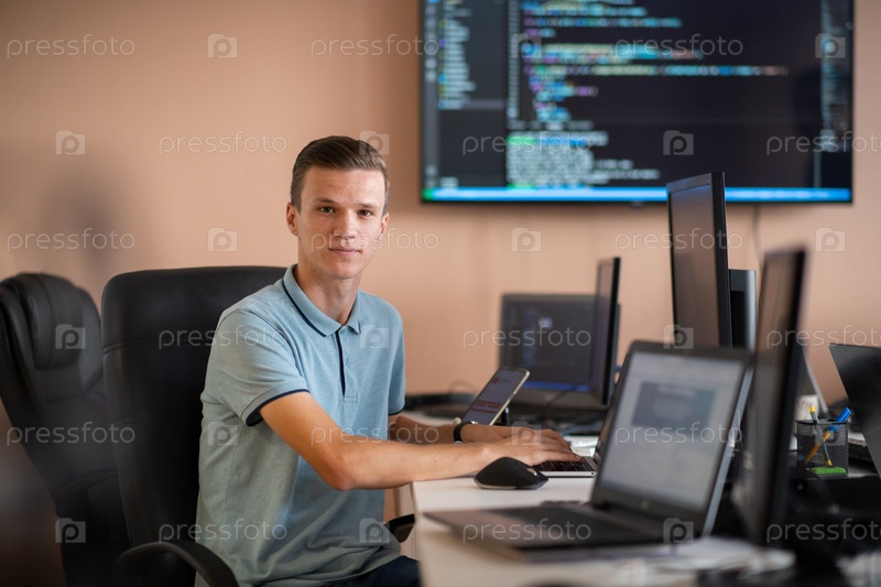 Инновации будущего: молодой программист тестирует новые приложения для смартфонов в офисе