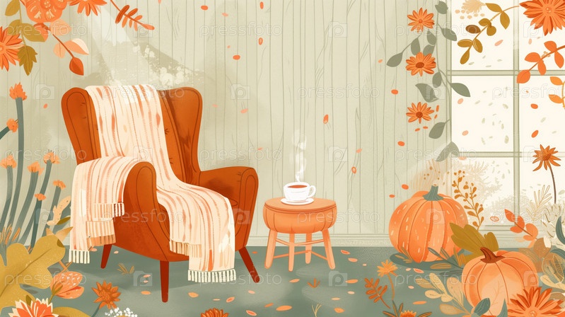 Уютный осенний уголок с креслом и клетчатым пледом