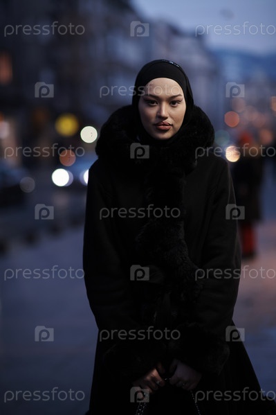Мусульманка идет по городской улице холодной зимней ночью в хиджабе