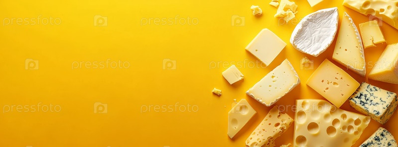 Яркий ассортимент сыров демонстрирует различные текстуры и формы на ярко-желтом фоне