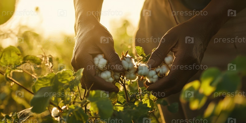 Руки, собирающие хлопок на залитом солнцем поле, запечатлевают изобилие природы