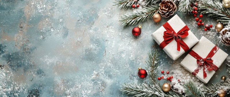 Красиво упакованный праздничный подарок, расположенный среди сосновых веток и украшений, воплощает дух Рождества с элегантностью и очарованием