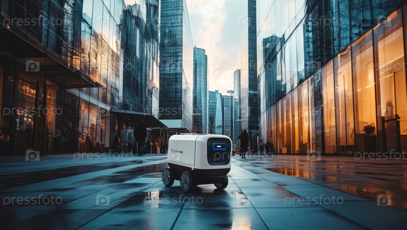 Автономный робот-доставщик пробирается по современному городскому ландшафту на закате