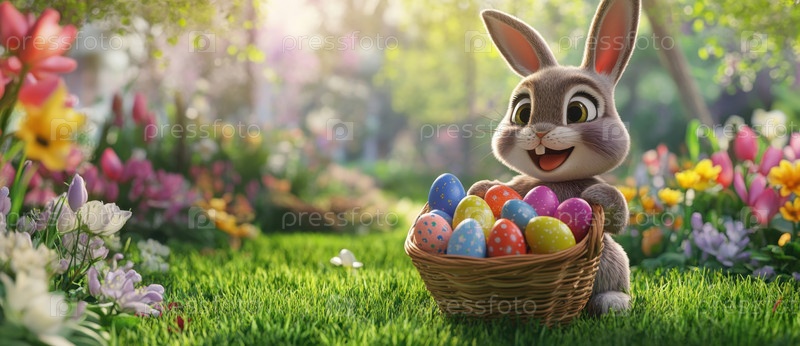 Это очаровательное изображение передает дух Пасхи с милым кроликом и красочными яйцами, излучающими радость и очарование, идеально подходит для дизайна на праздничную тематику или весенних акций