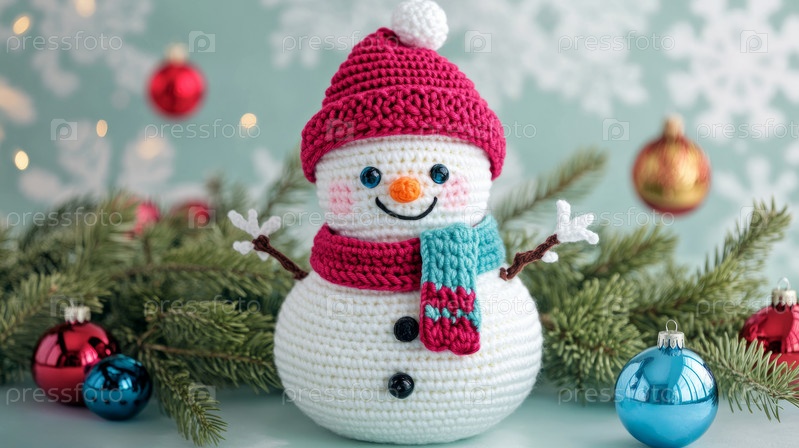 Праздничный вязаный крючком снеговик с праздничными украшениями