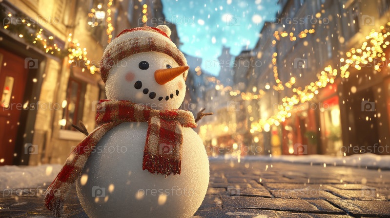 Праздничный снеговик в огнях ночного города