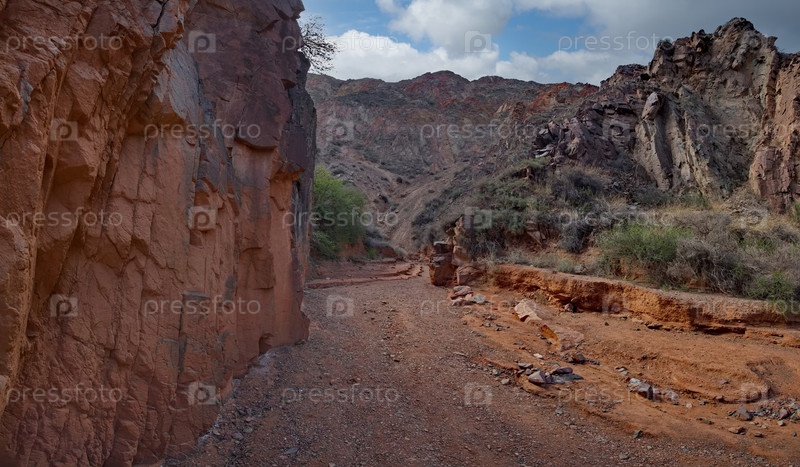 Северный Кыргызстан. Живописные извилистые тропы каньонов Кок-Мойнок с красно-коричневыми скалами вдоль реки Чу