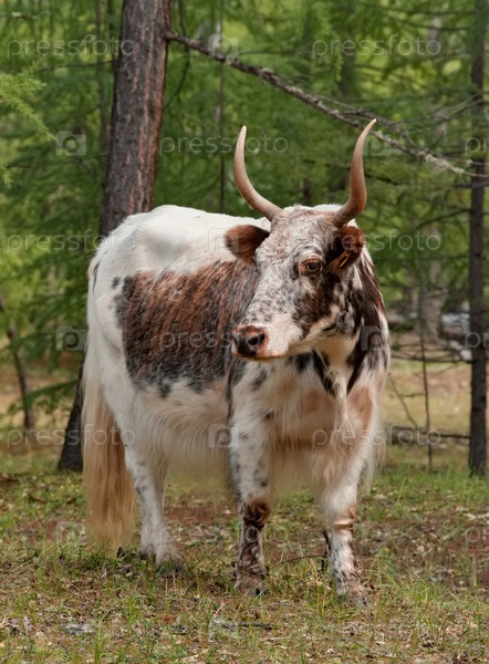 Россия. Западный Саян. Республика Бурятия. Необычная корова с длинной шерстью и большими рогами (гибрид скрещивания коровы и яка) пасется среди леса из лиственниц