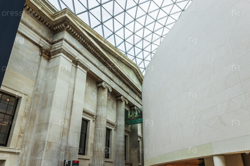Вид на интерьер Британского музея, демонстрирующий сочетание классической архитектуры и современной стеклянной крыши