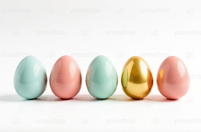 Пять элегантно декорированных пасхальных яиц в пастельных тонах с золотым декором на белом фоне