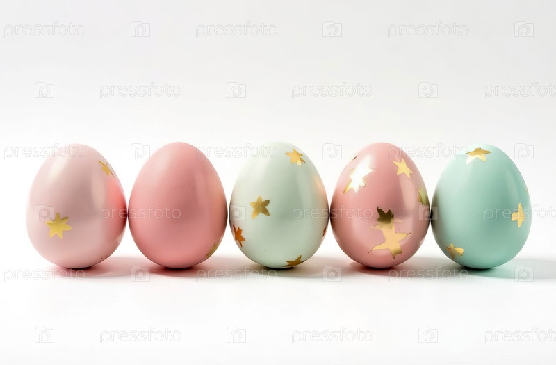 Пять элегантно декорированных пасхальных яиц в пастельных тонах с золотым декором на белом фоне